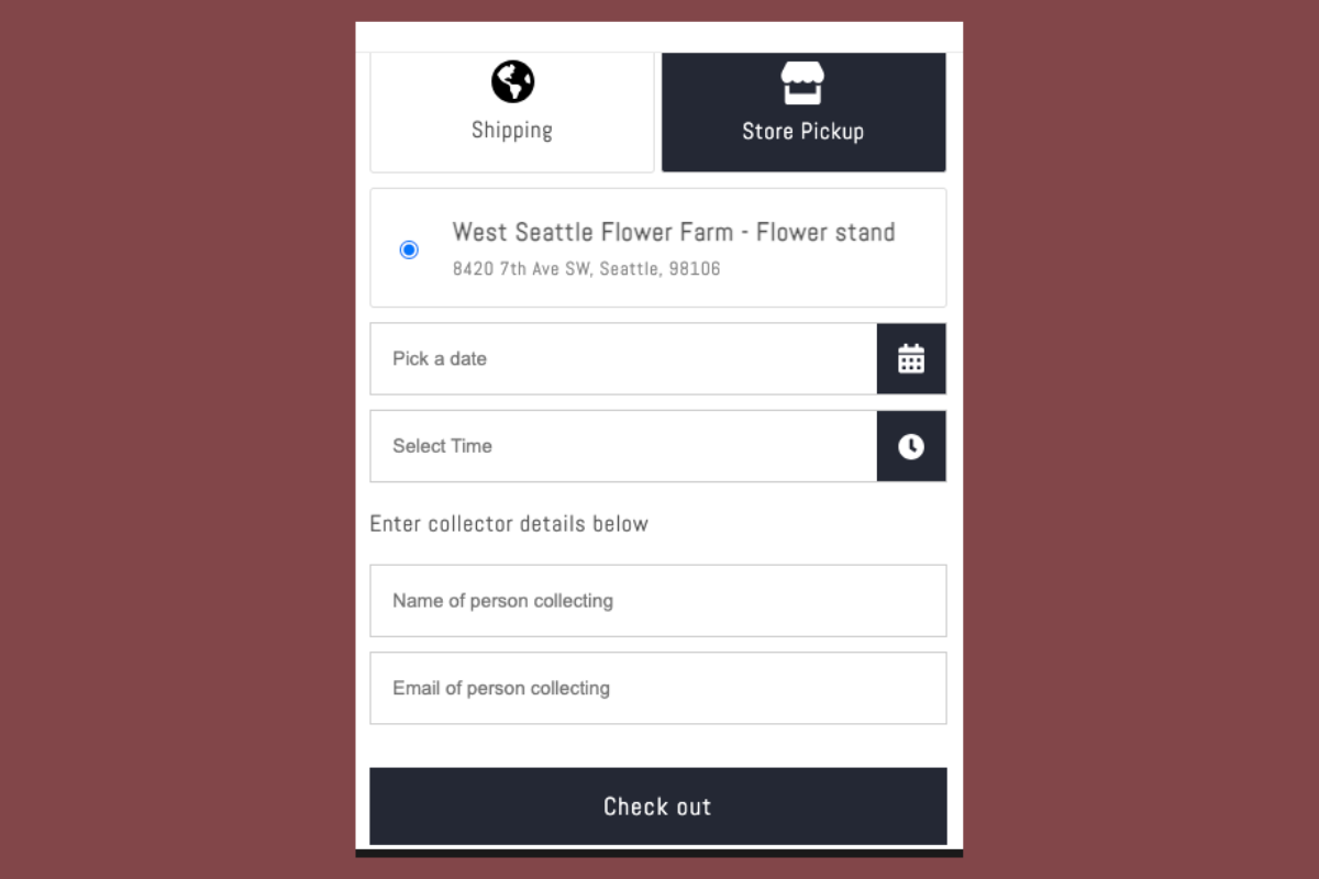 After adding items to your cart, you’ll be prompted to select a pick-up date and timeframe, plus enter a name and email address.