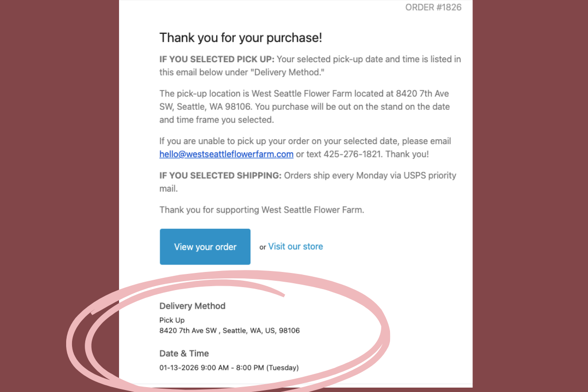 Search your email for "West Seattle Flower Farm" until your find an email with the subject line "Your WSFF order #{order number} : Pick up+shipping info"