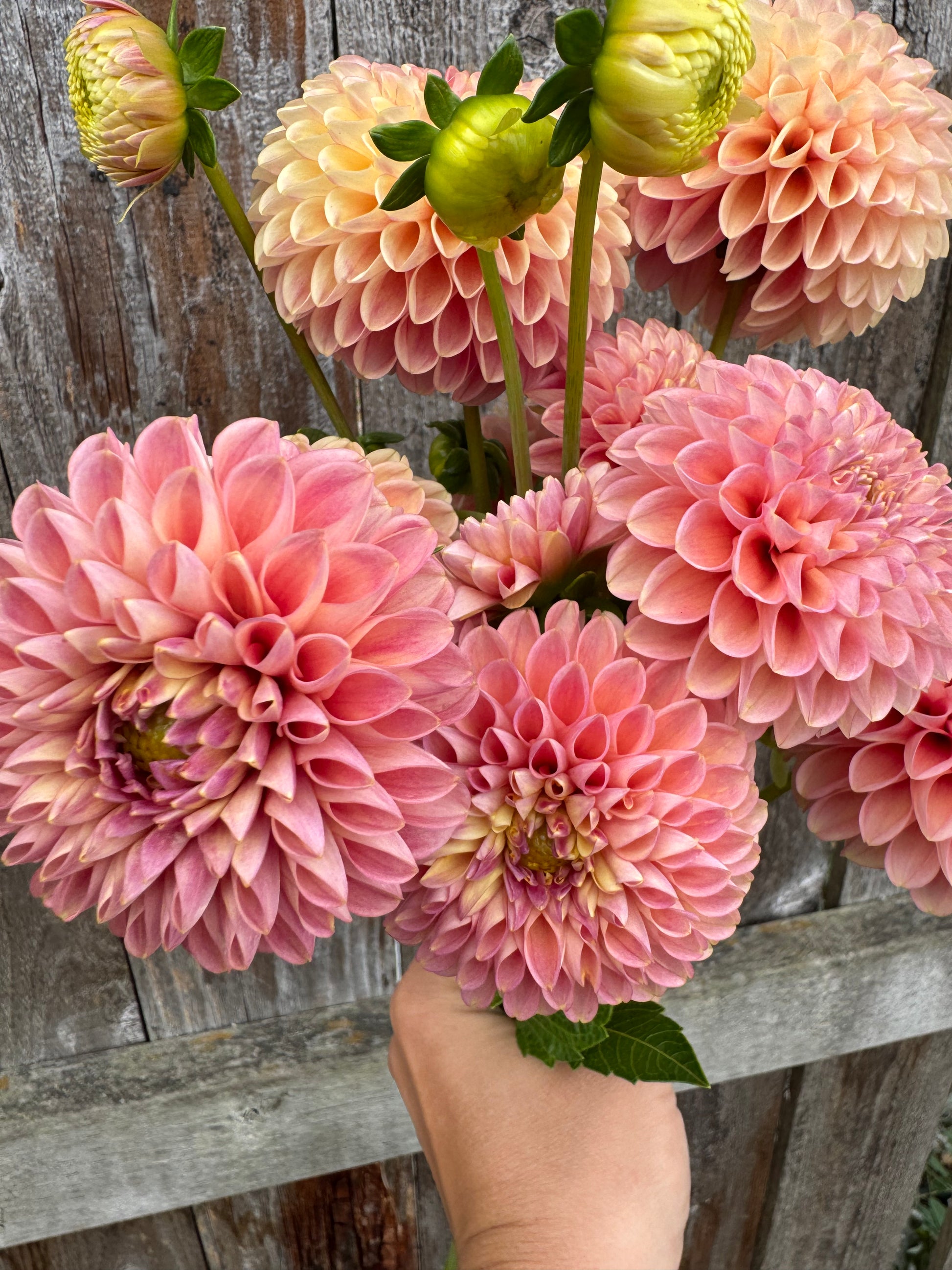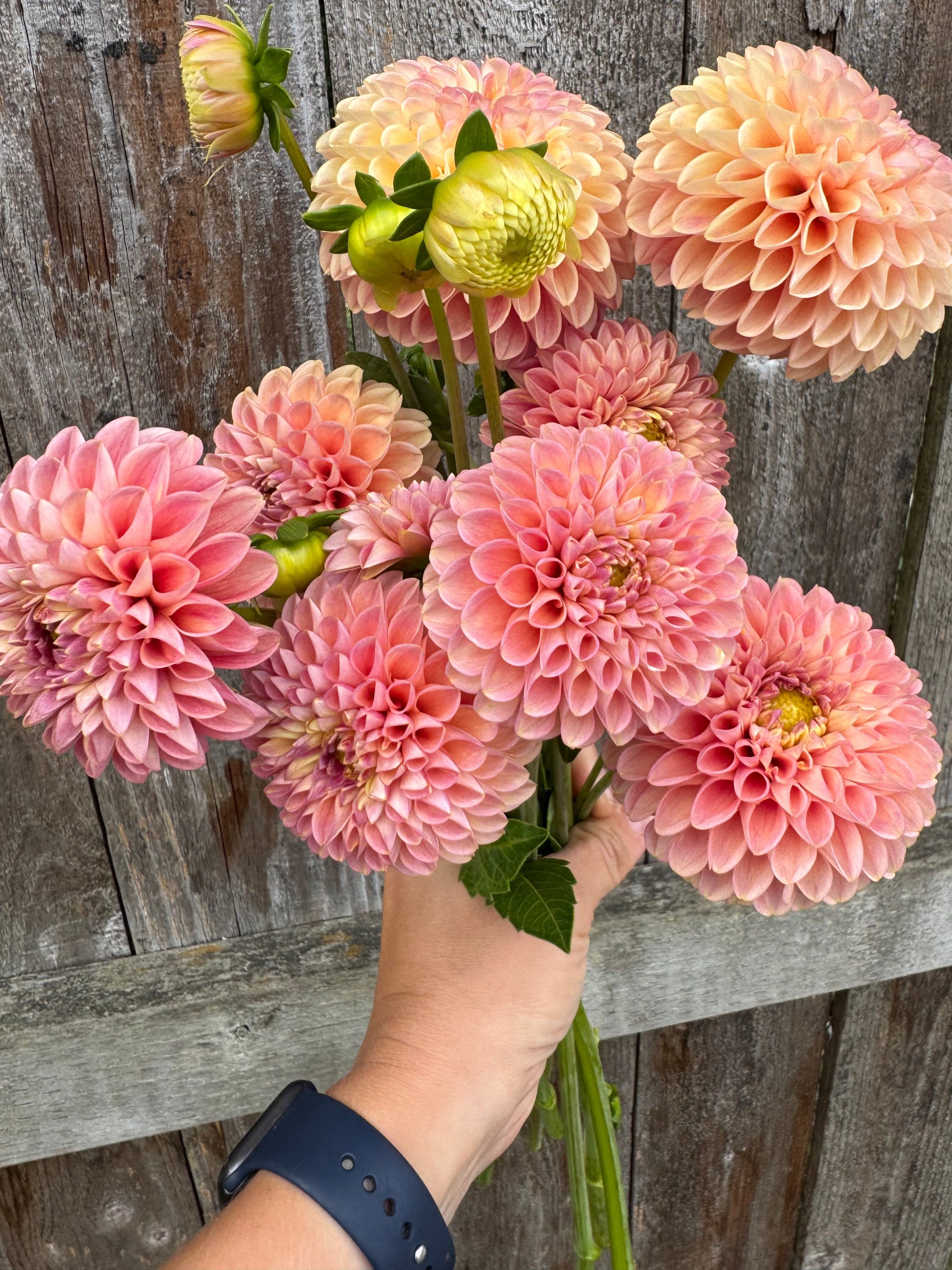 My favorite thing about this dahlia: The adorable cute-as-a-button center and the color shift from peachy pink to rosy pink as the season progresses.