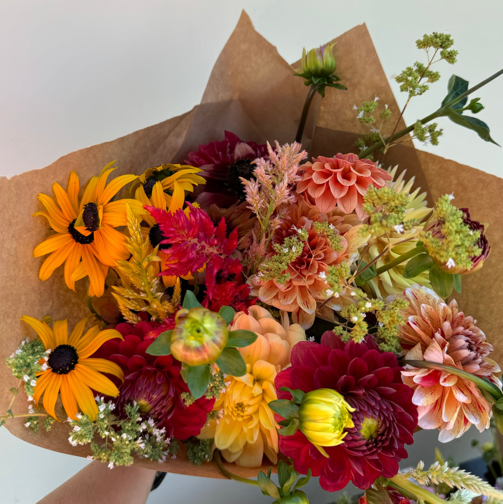 A large bouquet made up of dahlias as well as other flowers grown from a small urban farm in West Seattle.