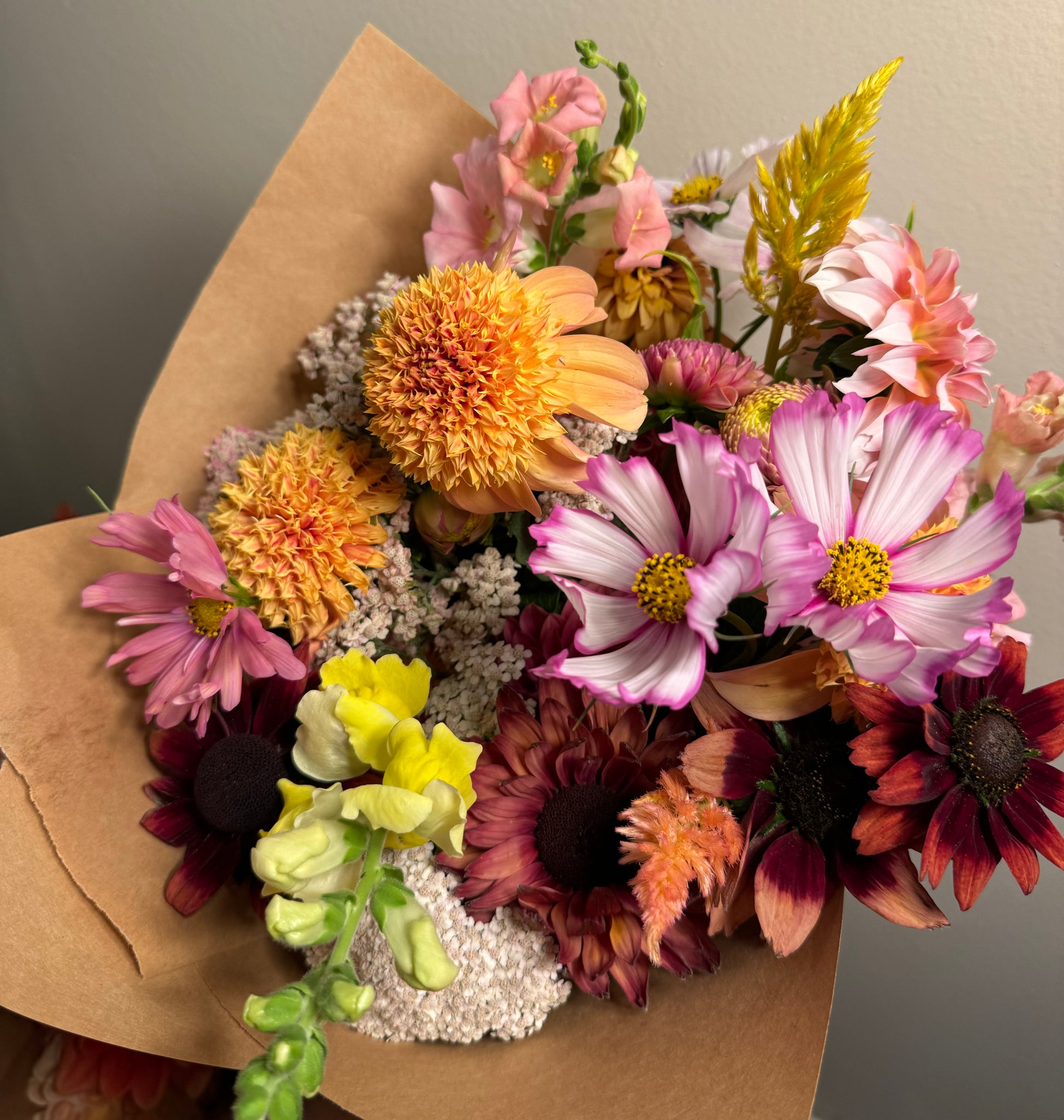 A market-wrapped bouquet filled with dahlias and other locally grown seasonal flowers.